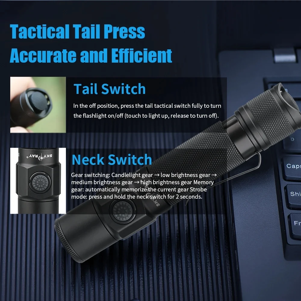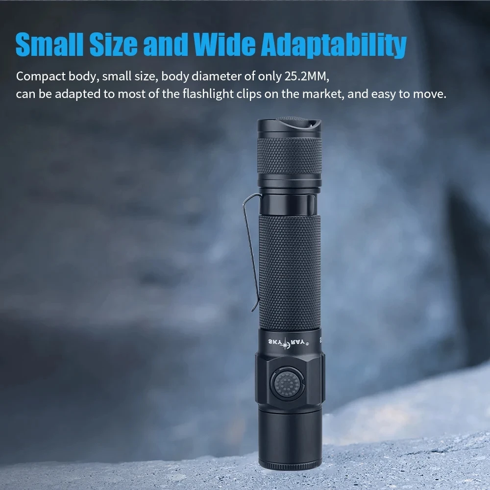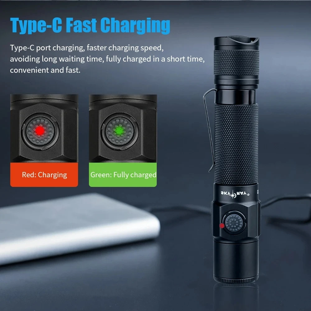 Specifications: Material: Aviation Aluminum AL6061-T6 Lumen Output: 1850 lumen Lighting Modes: 5 (Candelabra, Medium Rarefied, High Glossy Grade, Ultra Bright Gear, Burst Flashing) Battery Type: Rechargeable with Type-C port Waterproof Rating: IP68 Durability: Military Grade 3 hard anodized anti-abrasive treatment Features: |Self Defense| **Unmatched Durability and Performance** The SKYRAY S11 High Power Rechargeable LED Flashlight is a tactical flashlight designed for the most demanding environments. Crafted from robust aviation aluminum AL6061-T6, this flashlight is not only lightweight but also exceptionally durable. The military-grade hard anodized anti-abrasive treatment ensures that the flashlight can withstand the rigors of daily use and the harshest conditions. With a maximum output of 1850 lumens, the S11 provides a bright and focused beam that illuminates your surroundings with clarity, making it an ideal tool for self-defense and outdoor activities. **Versatile Lighting Modes for Every Situation** The SKYRAY S11 tactical flashlight offers five versatile lighting modes to suit various scenarios. Whether you need a soft candelabra glow for reading or a high-intensity burst flashing for emergency situations, this flashlight has you covered. The memory gear function ensures that your preferred lighting mode is always at your fingertips, while the strobe mode provides an additional layer of safety and attention-grabbing capability. **Built for Reliability and Convenience** The S11 tactical flashlight is not just about performance; it's also designed for convenience. The Type-C fast charge feature ensures that you can quickly recharge your flashlight, avoiding the frustration of long waiting times. The built-in intelligent temperature control system prevents overheating, extending the lifespan of the flashlight and enhancing user comfort. Additionally, the anti-reverse connection design safeguards against damage from improper battery usage, ensuring that your flashlight remains a reliable tool for years to come.