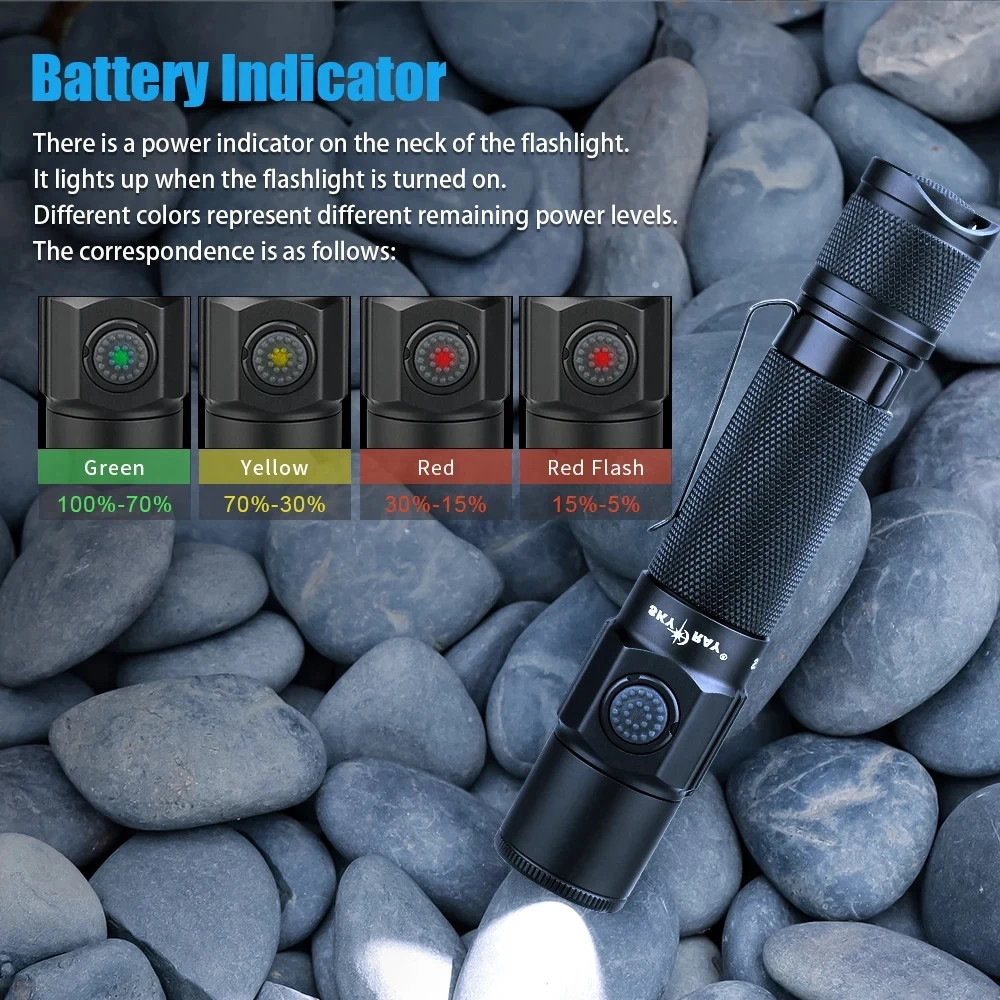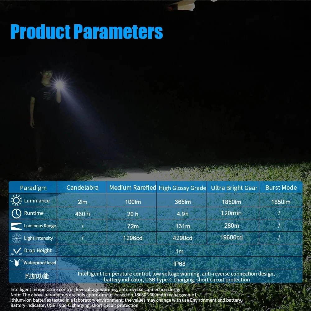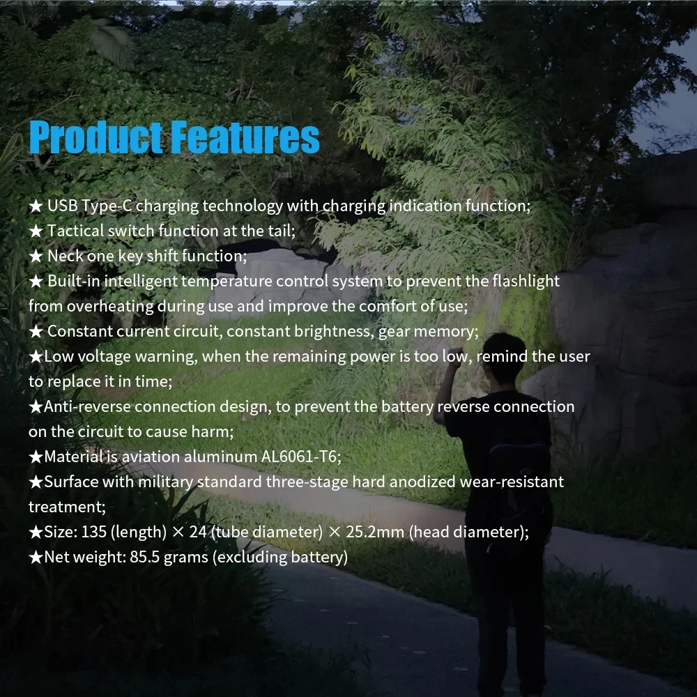 Built-in intelligent temperature control system to prevent the flashlight fromoverheating during use and improve comfort
