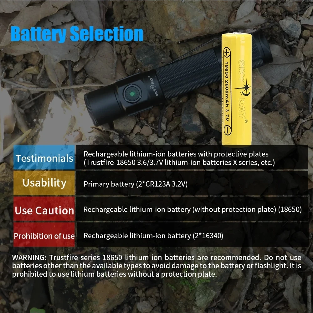WARNING: 18650 batteries are industrial batteries, not safe for civilian use. When the battery is of poorquality or used improperly (short circuit, high temperature, etc,), it may burn or explode, endangering thesafety of people and property, Use high quality carp ion batteries with protection plates to reduce the riskto some extent.Trustfire series batteries arerecommended.