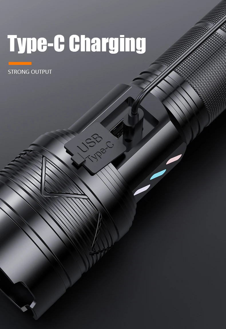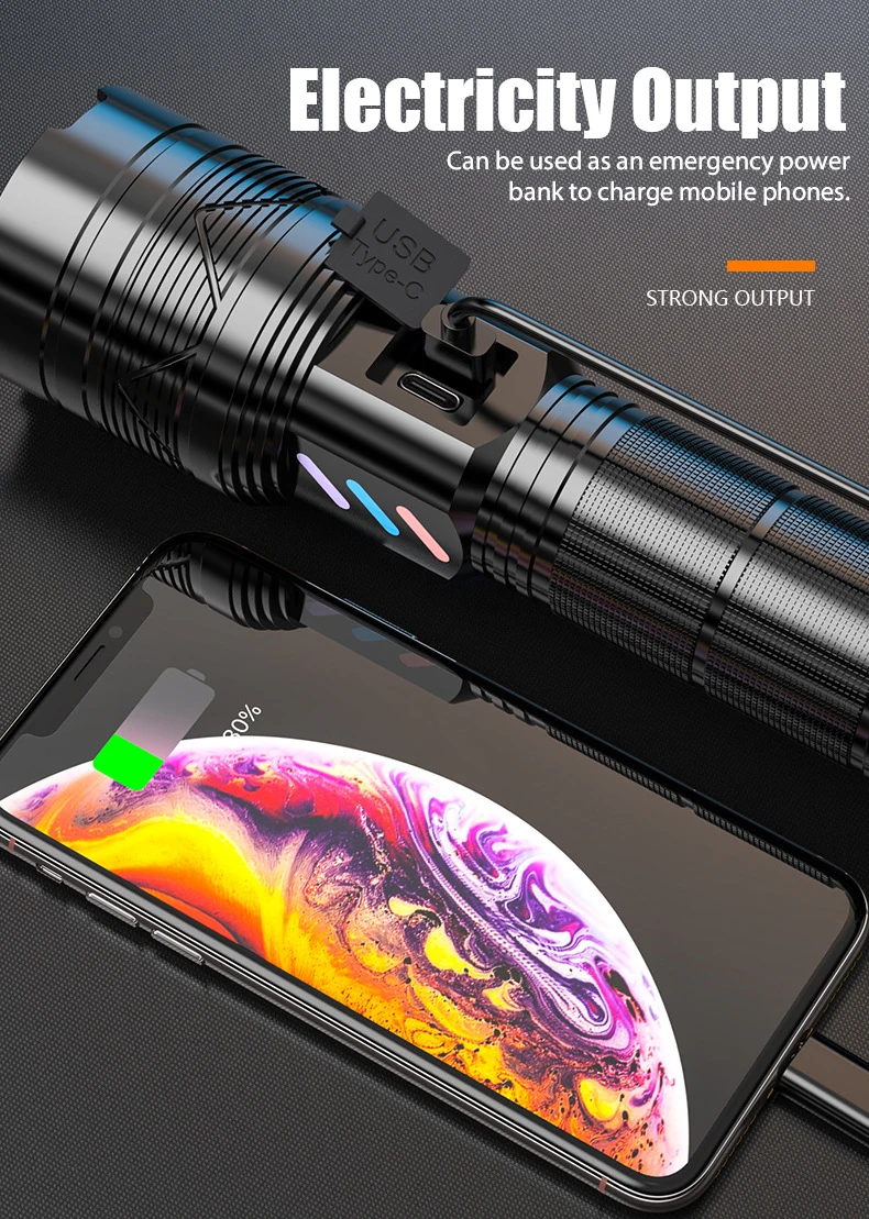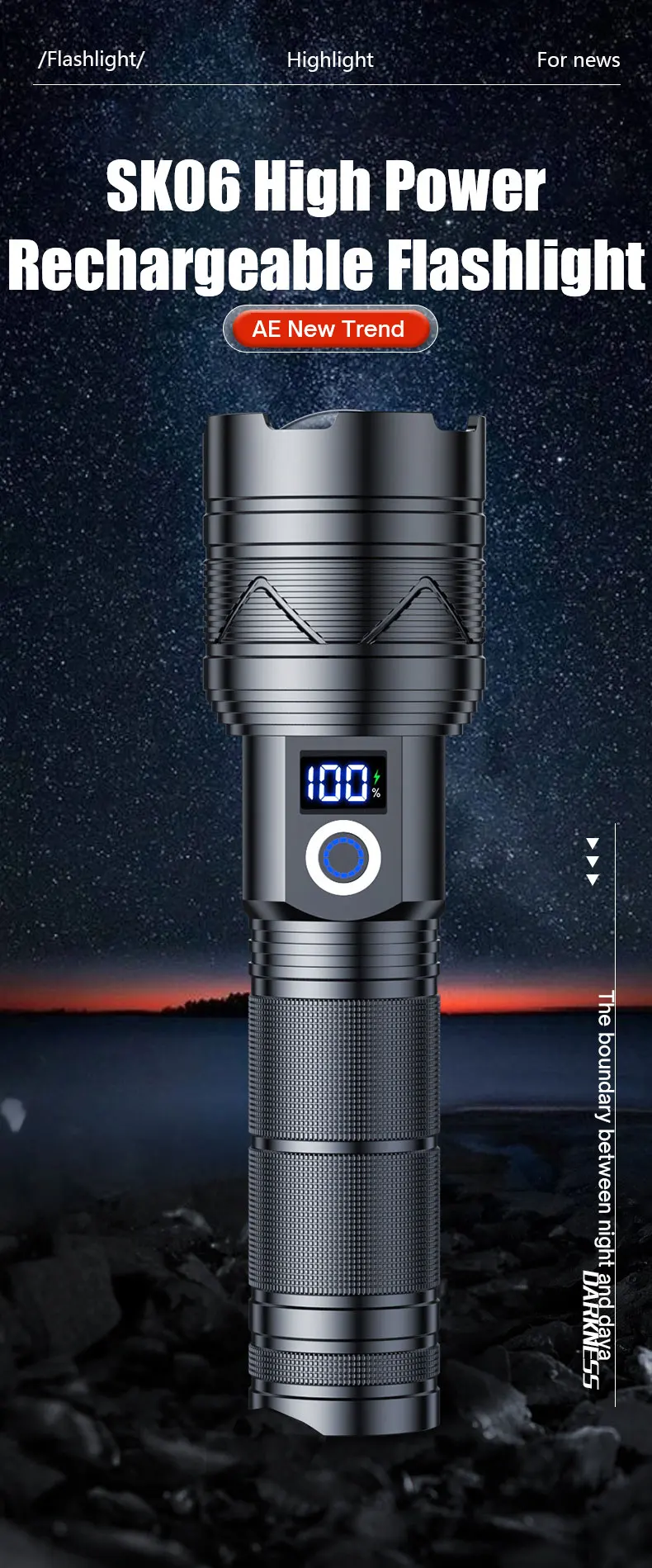 Specifications: Material: Durable ABS Plastic Light Output: 1000LM High Power LED Battery Life: Up to 50,000 hours Modes: 5 Lighting Modes (Strong, Medium, Weak, Strobe, SOS) Zoom Function: Telescopic Zoom for Focus Adjustment Emergency Power Bank: Yes Features: **Illuminate Your Adventures** The SKYRAY SK06 1000LM Flashlights Zoom Torch Light is a beacon of light for outdoor enthusiasts and campers. With a robust 1000LM output, this high power LED flashlight is designed to provide ample illumination in dark environments, ensuring safety and visibility. The SK06's telescopic zoom feature allows you to adjust the focus, transitioning from a spotlight to a floodlight with ease, making it an ideal tool for both far and near lighting needs. **Intelligent Design for the Outdoors** The SKYRAY SK06 is not just a flashlight; it's a smart companion for your outdoor adventures. The digital display provides a clear, real-time battery level indicator, ensuring you're always aware of your light's power status. The SK06's intelligent design extends to its emergency power bank functionality, enabling you to charge your mobile devices when you're away from civilization. **Built to Last and Versatile** Constructed from automotive-grade materials, the SKYRAY SK06 is built to withstand the rigors of outdoor use. Its robust design ensures a service life of up to 50,000 hours, providing consistent, flicker-free lighting. The SK06's versatility is further demonstrated by its five lighting modes, including a strobe and SOS feature, making it a reliable tool for various situations. Remember, the SKYRAY SK06 is not just a flashlight; it's a dependable companion for all your outdoor needs.