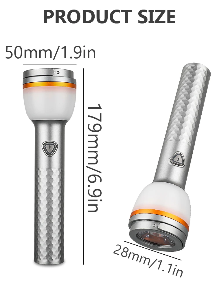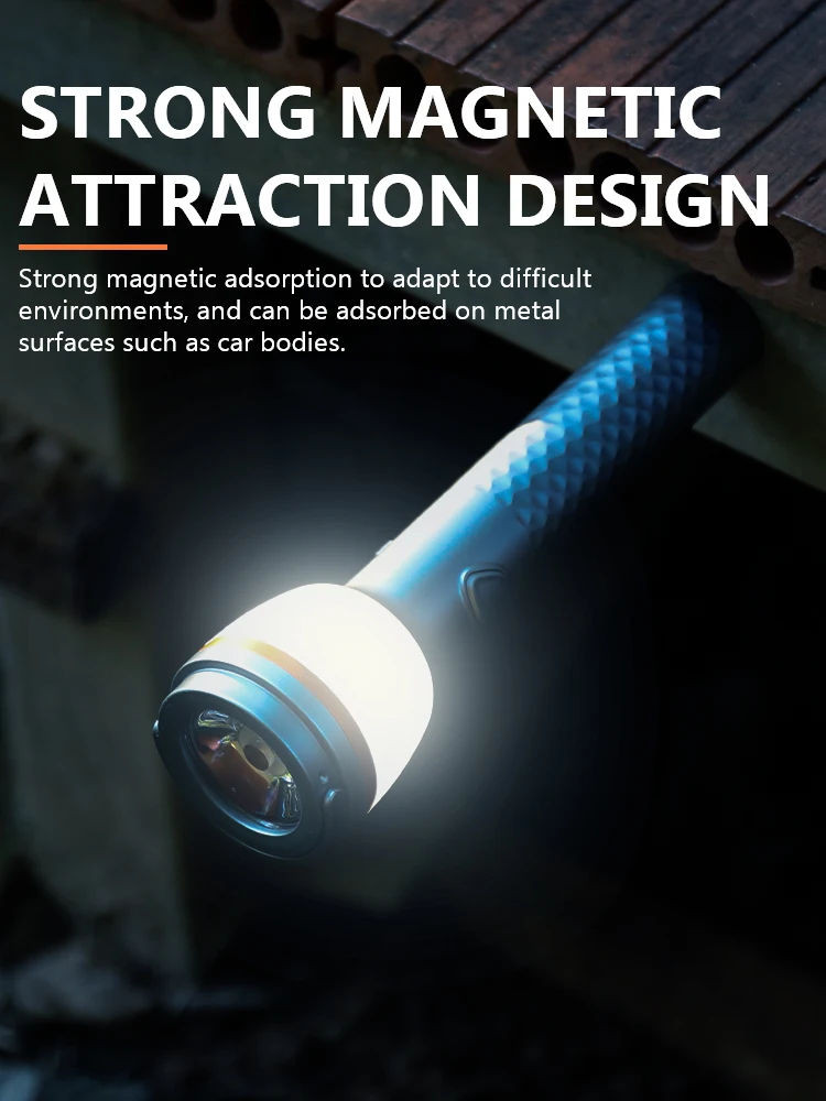 The shell is made of aluminum alloy, with strong magnetic adsorption to adapt to challenging environments. It can adhere to metal surfaces such as car bodies and can also be screwed onto a retractable tripod for use. Compact and lightweight, it features a power indicator: the green light indicates full power, the orange light indicates remaining power, and the red light indicates low power. Suitable for camping, car repair, power outage emergencies, etc.
